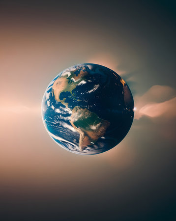 The image showcases a vibrant Earth globe set against a dark backdrop. The composition highlights continents and oceans with a warm color palette. The detailed texture and lighting suggest a celestial scene, potentially usable for illustrating scientific concepts, environmental themes, or design projects. The overall feel is one of wonder and exploration.