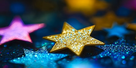 This captivating image features golden stars against a sparkling background, evoking a sense of celebration and joy, perfect for festive occasions or decorations.