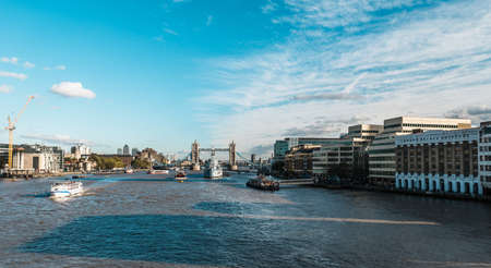 London - September 05 2019: Buildings and floating pubs iconic of London, viewed from the Thames, London September 05, 2019