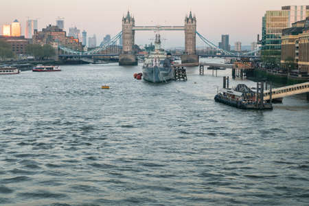 London, England - Apr 20, 2019 : HMS Belfast is a Town-class light cruiser that was built for the Royal Navy. She is now permanently moored as a museum ship in front of Tower Bridge on the River Thames, No focus, specifically.