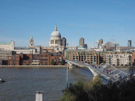 London, United Kingdom, Cityscape of the city of London with people walking at the famous millennium bridge and view of the St. Pauls cathedral.