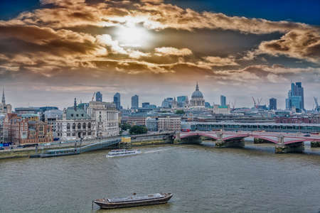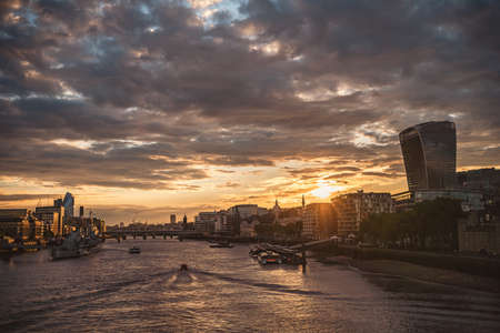 Thames River Embankment, London | UK - 2021.06.26: The view of the CIty Business District from the thames river on beautiful sunset evening
