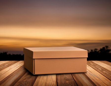 Cardboard box on wooden table with sunset sky background, mock up