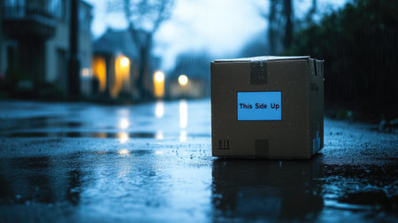 A cardboard box with a This Side Up label, standing alone on a wet pavement under a rainy sky