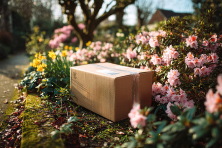 A cardboard package rests on garden path surrounded by vibrant flowers, symbolizing efficient logistics