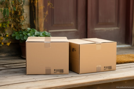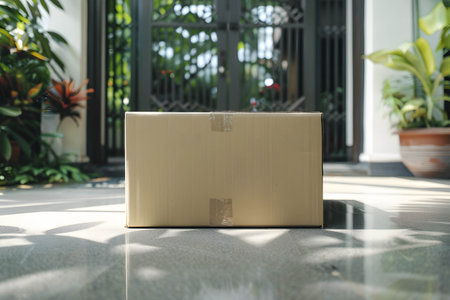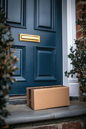 Cardboard package delivered to front door for online shopping delivery service concept