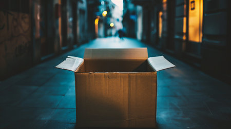 Open cardboard box on the street at night. Concept of online shopping.