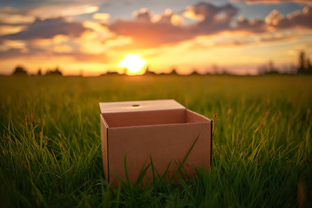 An open cardboard box sits on a grassy field illuminated by the warm glow of a sunset, symbolizing opportunities and inviting creativity in a tranquil setting.
