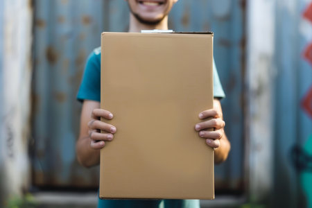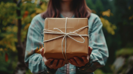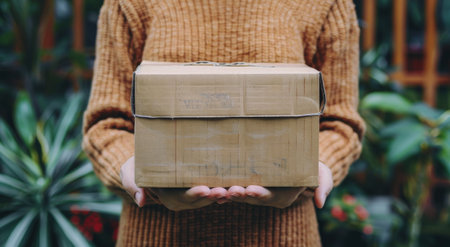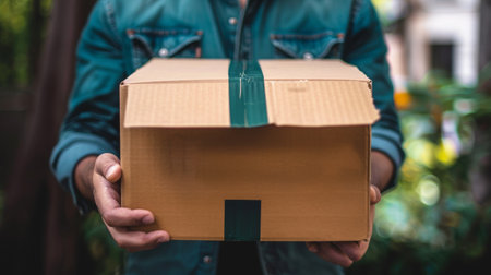 Close-up of a person holding a cardboard box, with a blurred green outdoor background, emphasizing delivery, shipping, and logistics concepts.