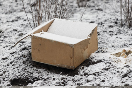 A cardboard box is covered in snow and is sitting on the ground. The box is empty and appears to have been discarded. Concept of abandonment and neglect, as the box is left out in the cold