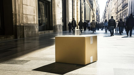 photo of a blank cardboard box in the middle of a pedestrian walkway in a busy city, captured in bright afternoon light --chaos 12 --ar 16:9 --weird 150 --v 6.1 Job ID: a29232e7-d765-4838-898e-2f8555385433