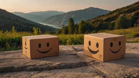 Cardboard boxes with smiley faces on the background of the mountains