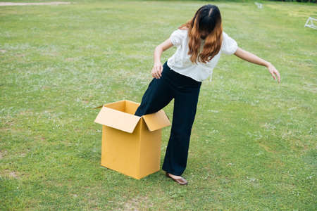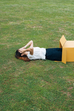 Young asian thai woman hipster curly hairstyle on white shirt sleeping on glass field with lower body inside cardboard box.