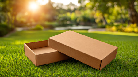 Empty open rectangular cardboard box placed on grass field in park during sunny day, packaging mock up, delivery and ecology concept