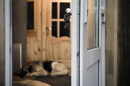 Unlocked door and a dog lying inside a house, focus in the foreground