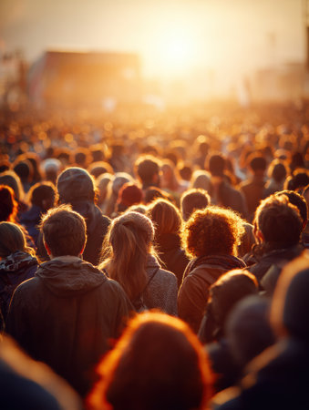 A large crowd gathers together, immersed in excitement as the sun sets, casting a warm glow over the scene. Joyful faces are illuminated by the fading light.