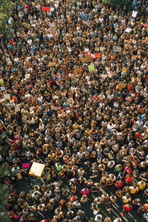 View from a high viewpoint of multiethnic people clapping at a protest.