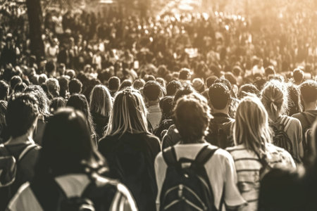Chaotic Urban Gathering: A Crowded City Street Scene with Diverse People, Backpacks, and Vibrant Atmosphere.