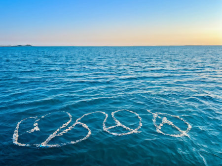 Numbers formed from sand display the year 2030 on a peaceful coast. Gentle waves wash ashore as sunlight reflects on the water, creating a serene atmosphere.