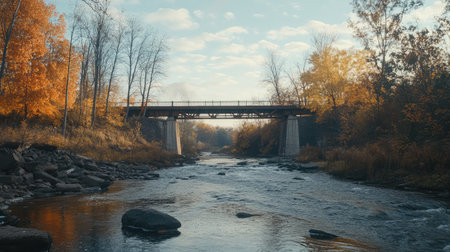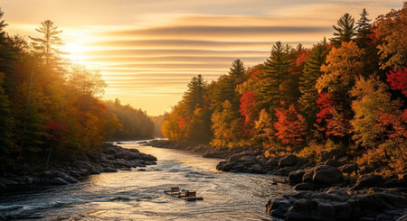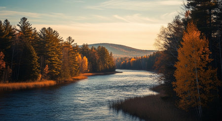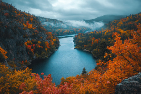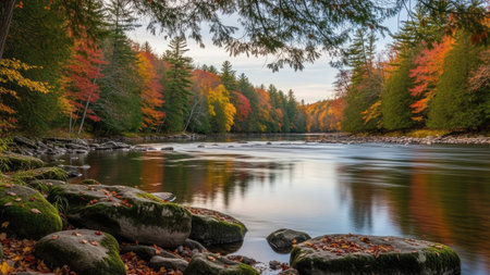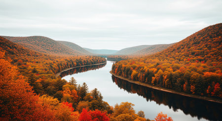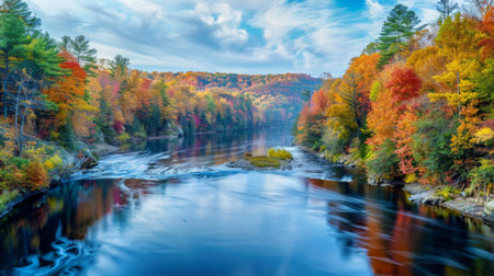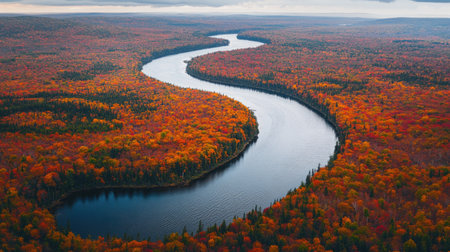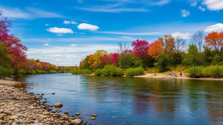 A picturesque river bend with colorful autumn foliage on the banks, seasonal beauty