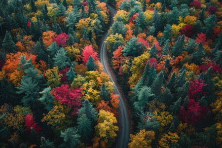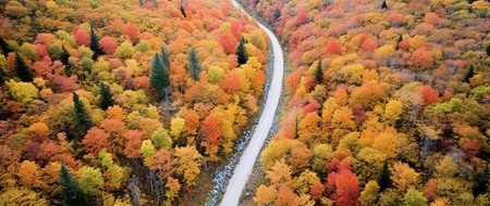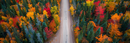 Aerial perspective of a road surrounded by vibrant autumn foliage and colorful trees