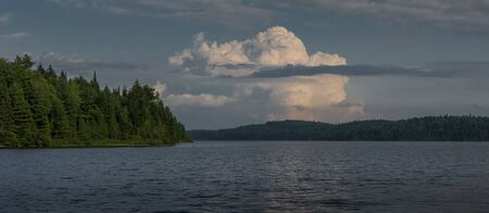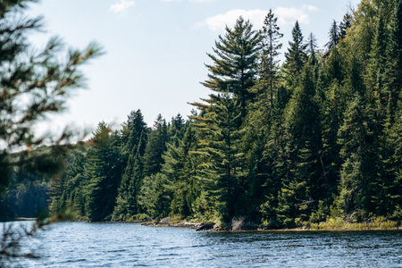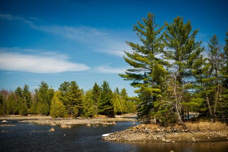 The rocky shores of a Canadian lake in the Ontario wilderness evergreen forest.
