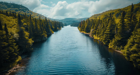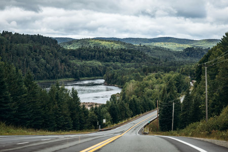Scenic highway running through a lush green forest with a wide river and rolling hills near La Tuque in Quebec, Canada