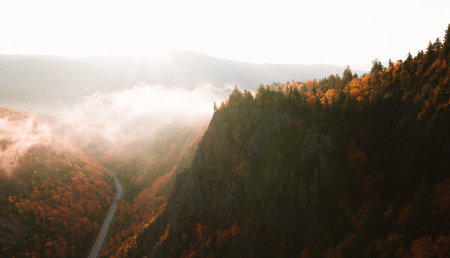 Table Rock New Hampshire Epic Sunrise Wide View Low Clouds and Beautiful Warm Light Orange Colored Trees on Steep Rock Wall
