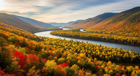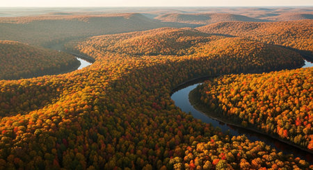 Winding river reflecting vibrant autumn colors of the dense forest valley. scenic landscape with colorful fall foliage on rolling hills under a clear sky.