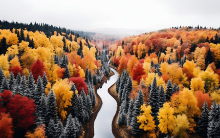 Majestic aerial shot of a river meandering through a forest, with autumn foliage in vivid hues