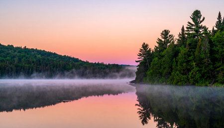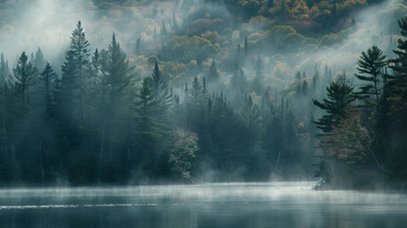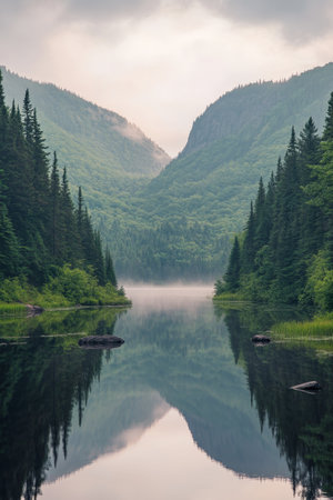 Serene Mystical Lake Reflecting Rugged Mountains and Foggy Horizon in a Dense Forest Setting