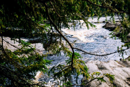 Mountain river in autumn. Quebec, Canada. River in the boreal forest.