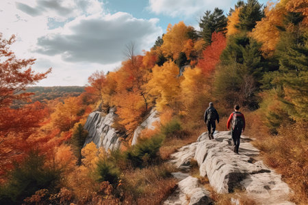 two people walking on a rocky trail surrounded by colorful trees in the fall season with blue sky and white clouds