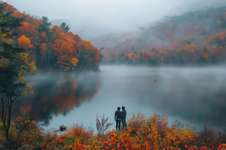 Couple standing by lake surrounded by trees, gazing out, A landscape shot of a couple gazing out over a misty lake, surrounded by a blanket of autumn colors