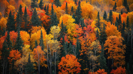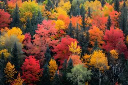 A dense forest is bursting with a variety of trees in vibrant shades. The canopy is alive with hues of red, orange, yellow, green, and purple, creating a captivating display of diversity and beauty. Generative AI