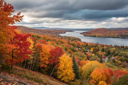 Panoramic autumn landscape vibrant foliage, lake, hills, cloudy sky.