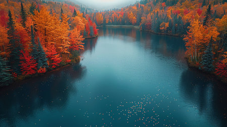 An aerial view reveals a wide, winding river flowing through a dense forest ablaze with the vibrant colors of autumn. The trees display a rich tapestry of greens, yellows, oranges, and reds, creating a striking contrast with the deep blue of the river. The sunlight illuminates the scene, highlighting the textures of the foliage and the movement of the water. The river's course snakes through the landscape, with small islands and rocky outcrops visible. The overall impression is one of...