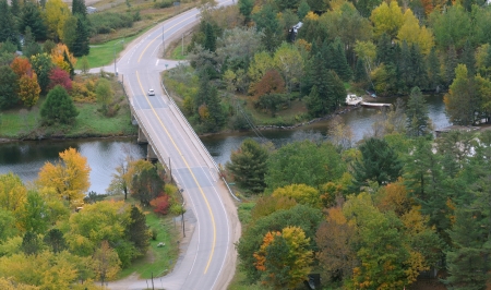The Falls and Bridge in autumn with colorful trees and the blue sky.