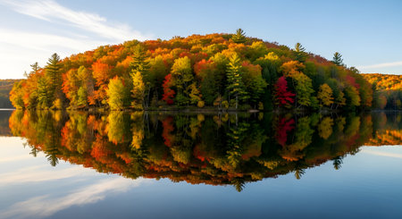 A stunning reflection of a colorful autumn forest on a still lake, showcasing the beauty of fall foliage.