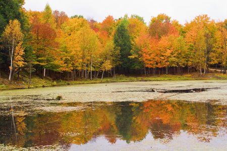 Autumn forest reflected in the lake. Fall colors in the forest.