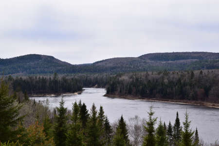 View on the Valin river, the forest on a cloudy day from the top of Pic de la Tete de Chien, a peak of Monts Valin National Park in Saguenay (Quebec, Canada)