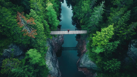Aerial shot of a man on a cliff bridge with a view of a river winding through the forest. Travel adventure and exploration of untouched natural beauty
