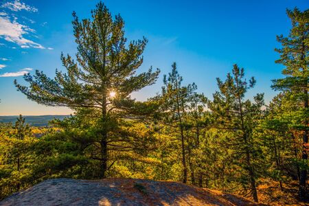The sun shines through evergreen trees on top of a rocky cliff in a forested landscape during the autumn season.
