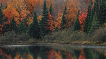 Autumn forest landscape and reflection in the lake at sunset. La Mauricie National Park, Canada.