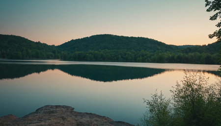 A serene lake reflecting a forested shoreline under a clear sky, perfect for a nature background.