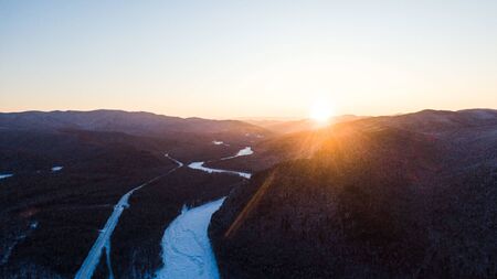 Aerial image from the top of snowy mountain pines in the middle of the winter.