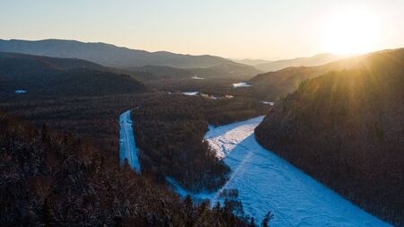 Autumn Aerial Fall Foliage Road Cascade Lakes Adirondacks New York New England. Colorful Forest Road Scenic Drive Low Clouds Moody Beauty
