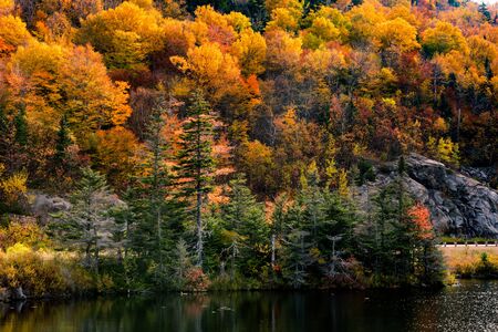 Fall forest with colorful autumn leaves and highway 60 reflecting in Lake of Two Rivers. Algonquin Park, Ontario, Canada.