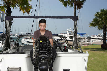 Repairing engines on aluminum boats , The technician is removing the boat parts to make the paint