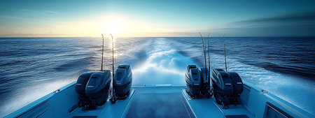 A sleek, high-speed boat with multiple fishing rods cruises through calm ocean waters during a breathtaking sunset, creating a serene and adventurous atmosphere.